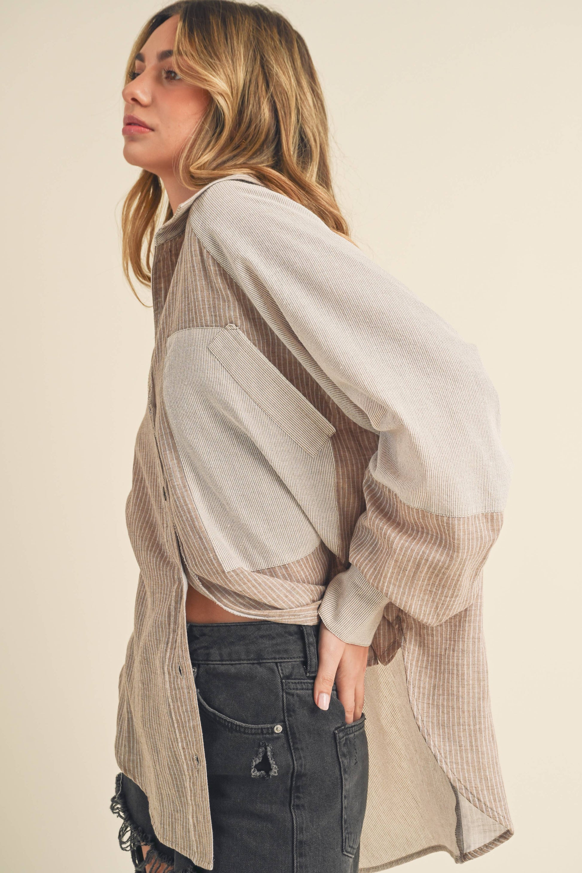 The Shia Colorblock Button Down puts a chic twist on a timeless favorite. Designed with contrasting panels and subtle texture play, this top delivers that effortlessly cool, laid-back look you love while still feeling elevated. A hidden tack between the second and third buttons keeps the fit flattering and secure — no gaping here, ladies!