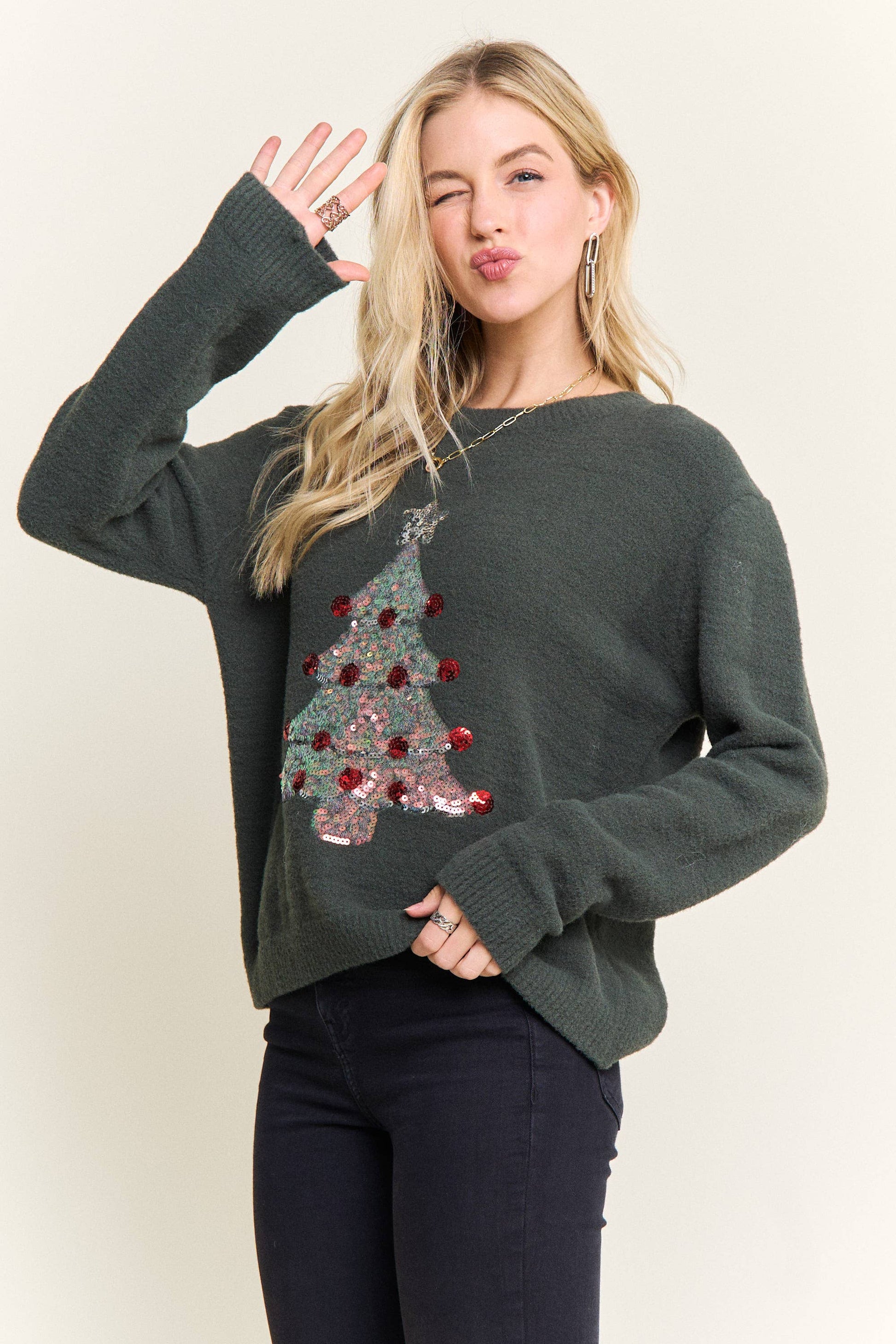 Get ready to shine bright this season in the Holly Jolly Sequin Sweater! This ultra-soft knit brings all the cozy feels with a festive twist — featuring a sparkling sequin Christmas tree topped with a glittering star. The relaxed fit and round neckline make it easy to style for any holiday occasion, from festive family gatherings to cozy nights by the fire.