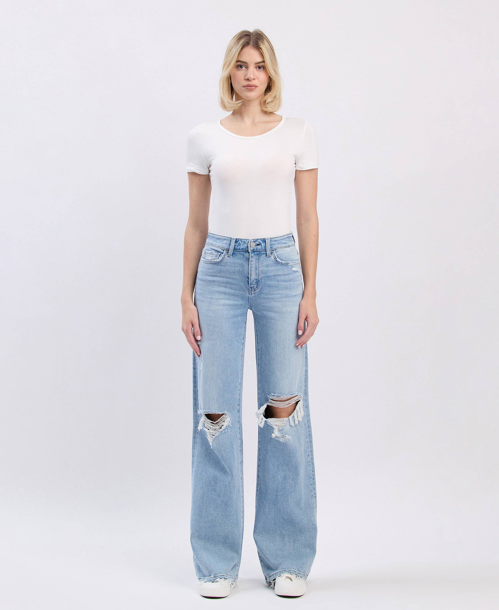 The Rebel Comfort Stretch Jean by Flying Monkey gives you the perfect mix of style and wearability. Designed with a high-rise waist, relaxed straight leg, and edgy knee distressing, these jeans bring that cool-girl vibe you love — but with hidden comfort stretch that moves with you. Finished in a light wash with a raw hem, they’re your new go-to for everything from errands to nights out.