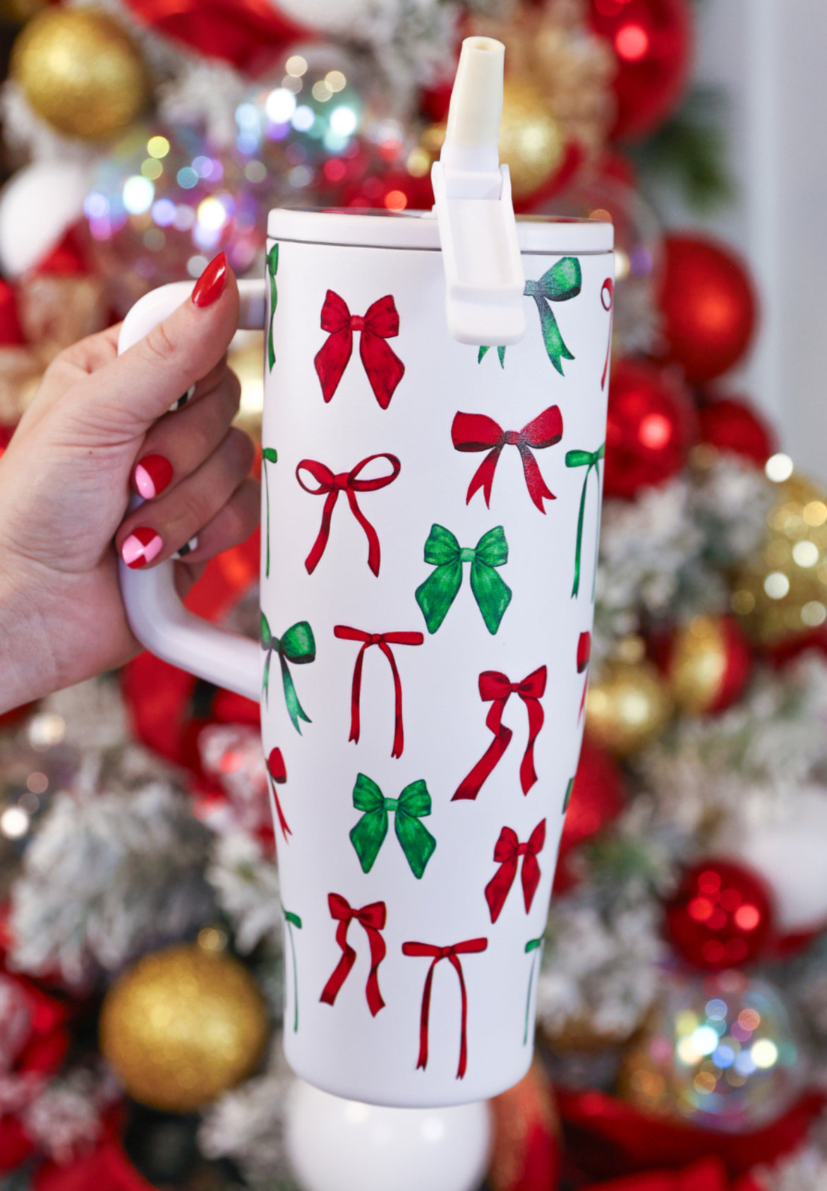 Enjoy your holiday drinks with the Midnight Bow Christmas Edition Sleek Tumbler! Featuring our fan favorite Midnight Bow design with a Christmas twist! This trendy tumbler has a sleek body shape that keeps your beverages cool while adding a cheerful touch to your festive style!